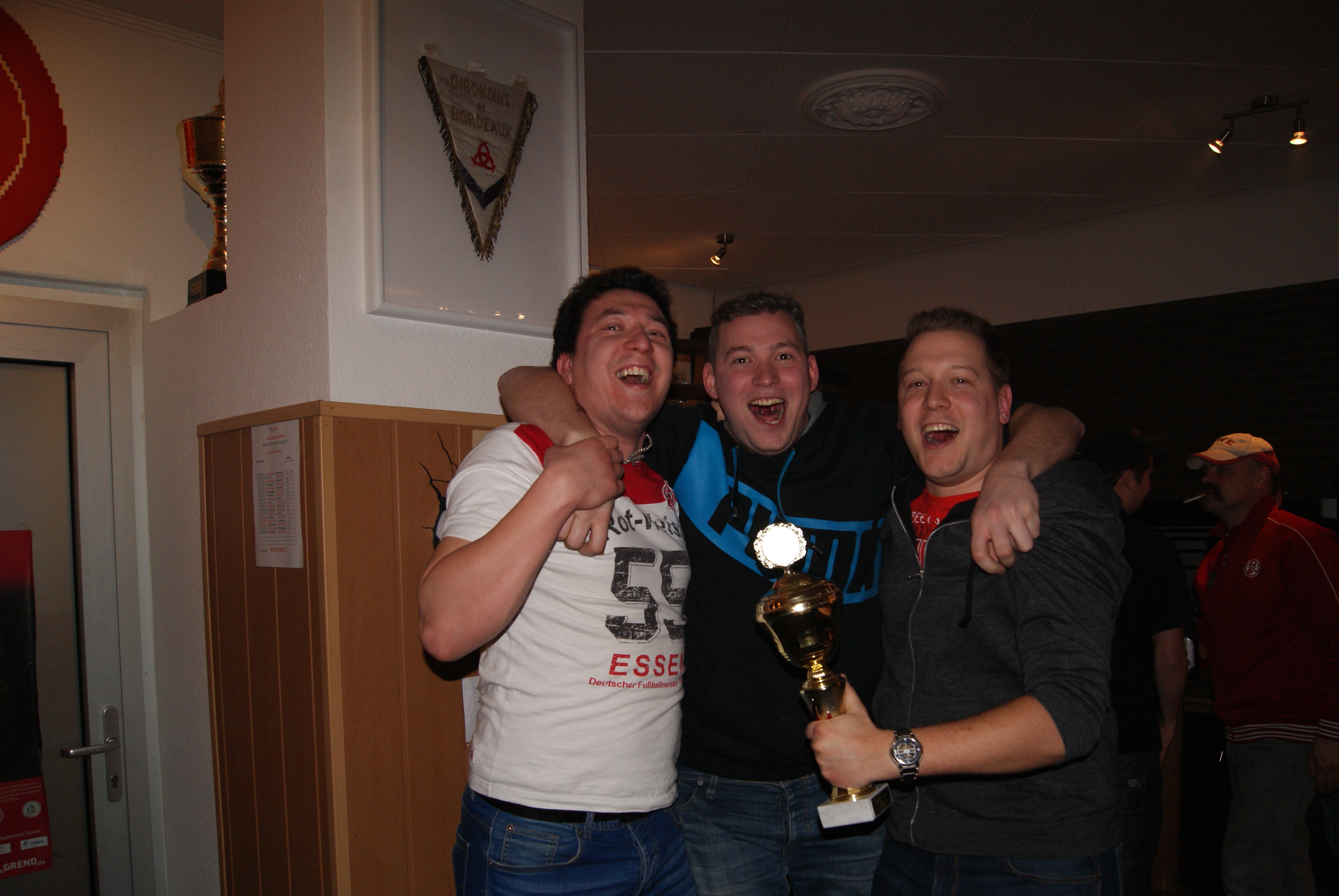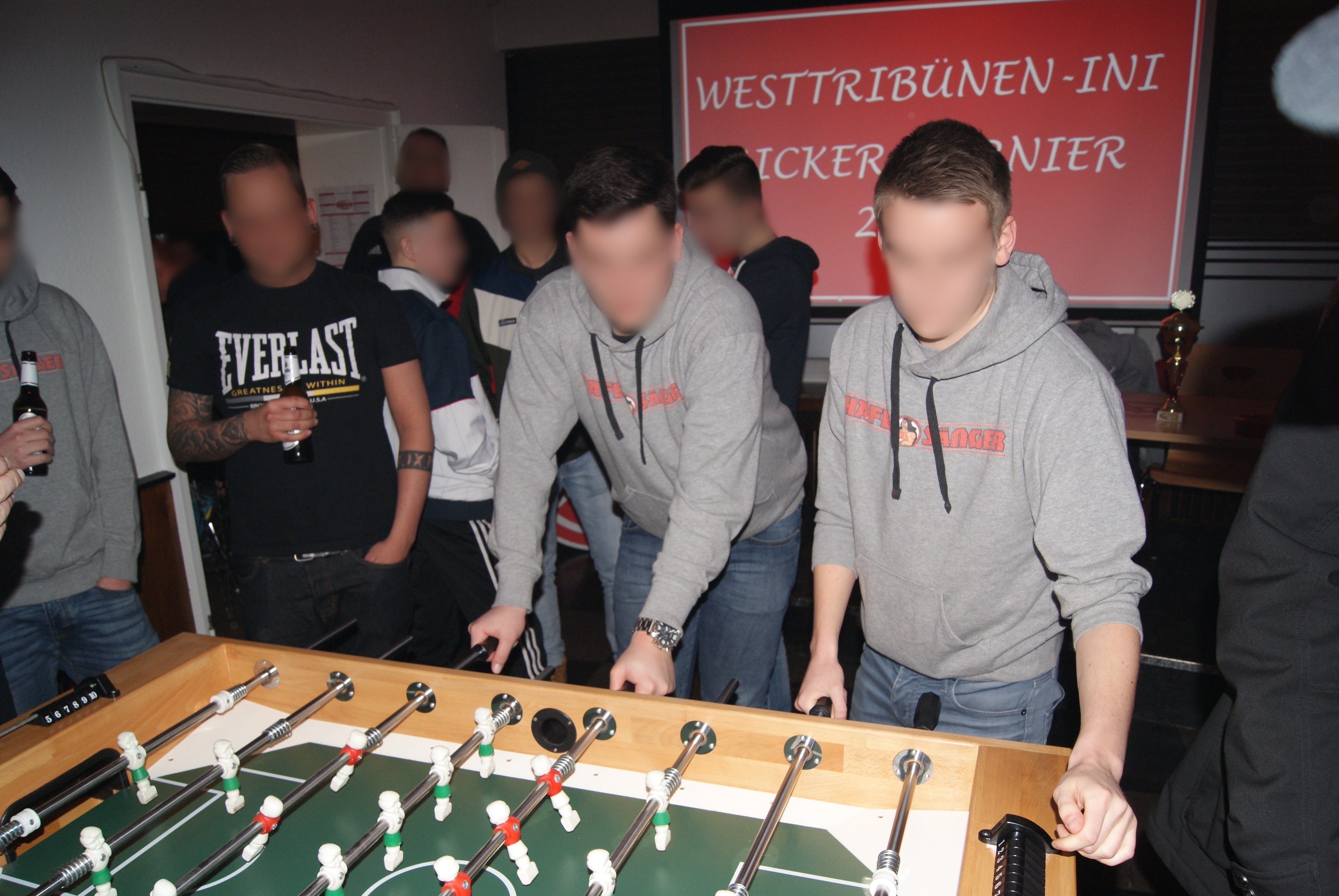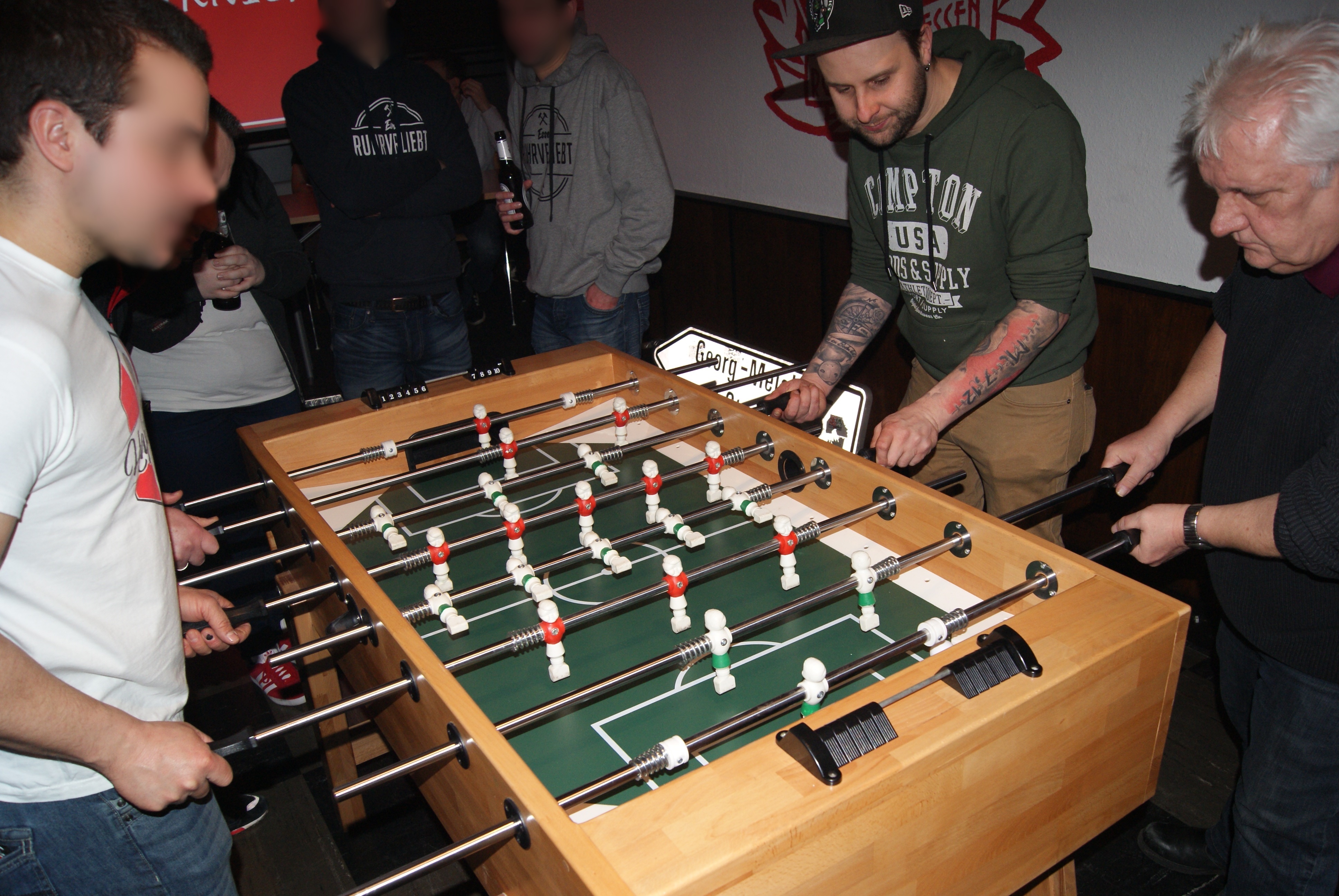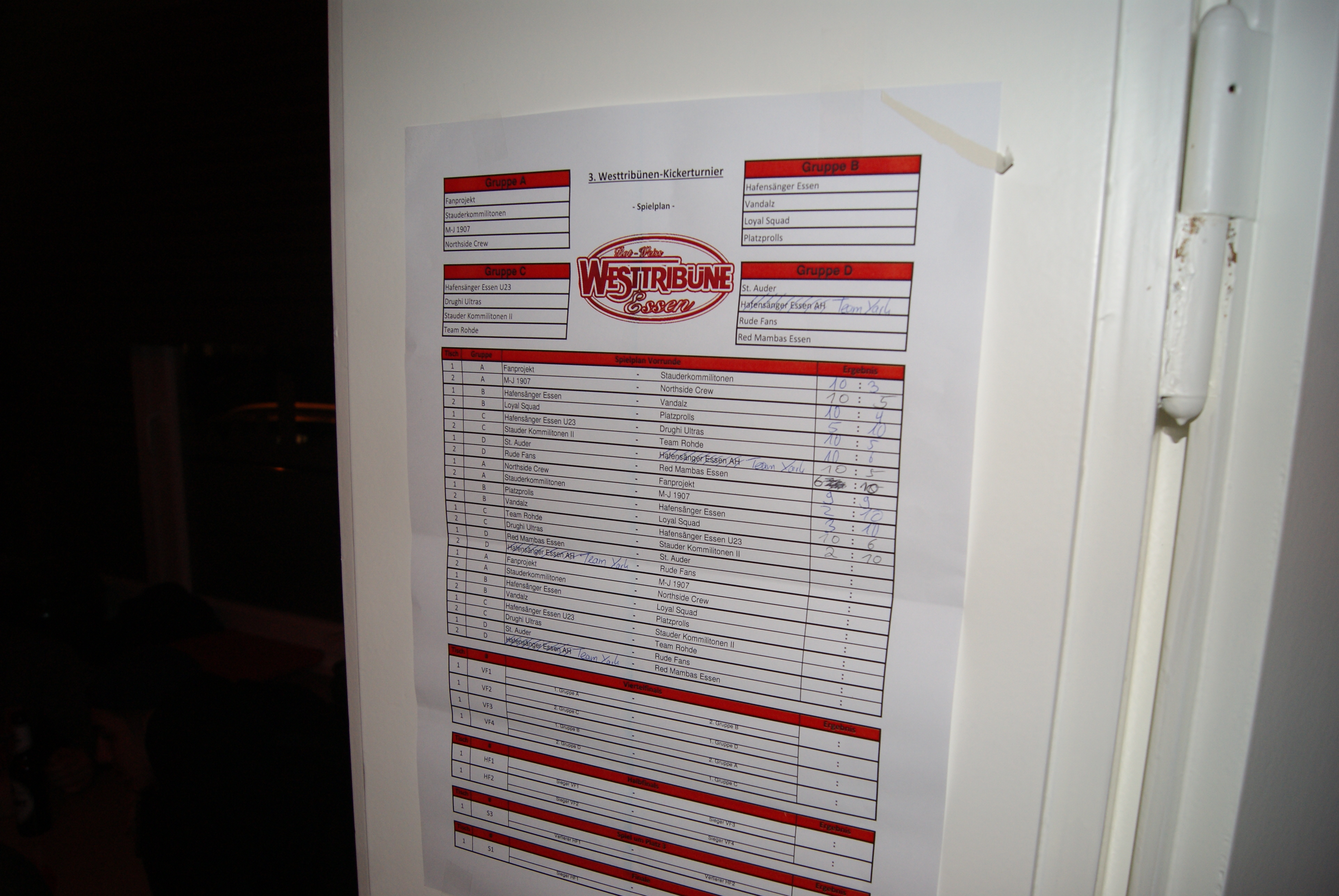 Am Freitag, den 10. Februar, stand das 3. Westtribünen-Kickerturnier an. 16 Mannschaften, davon zwei Teams aus dem Kreise der Fördermitglieder und ein Fanprojekt-Team, lieferten sich wieder astreine Begegnungen am Kickertisch. Die Stimmung war hinsichtlich des schwerwiegenden Verlustes, der unsere Fanszene in der letzten Woche schockte, bei einigen Leuten deutlich zurückhaltender. Der allgemeine Tenor war es aber, ohne die übliche Thekenmeisterschaft dieses Jahr auszuspielen, in der rot-weissen Gemeinschaft auf Ruhrmichell anzustoßen.