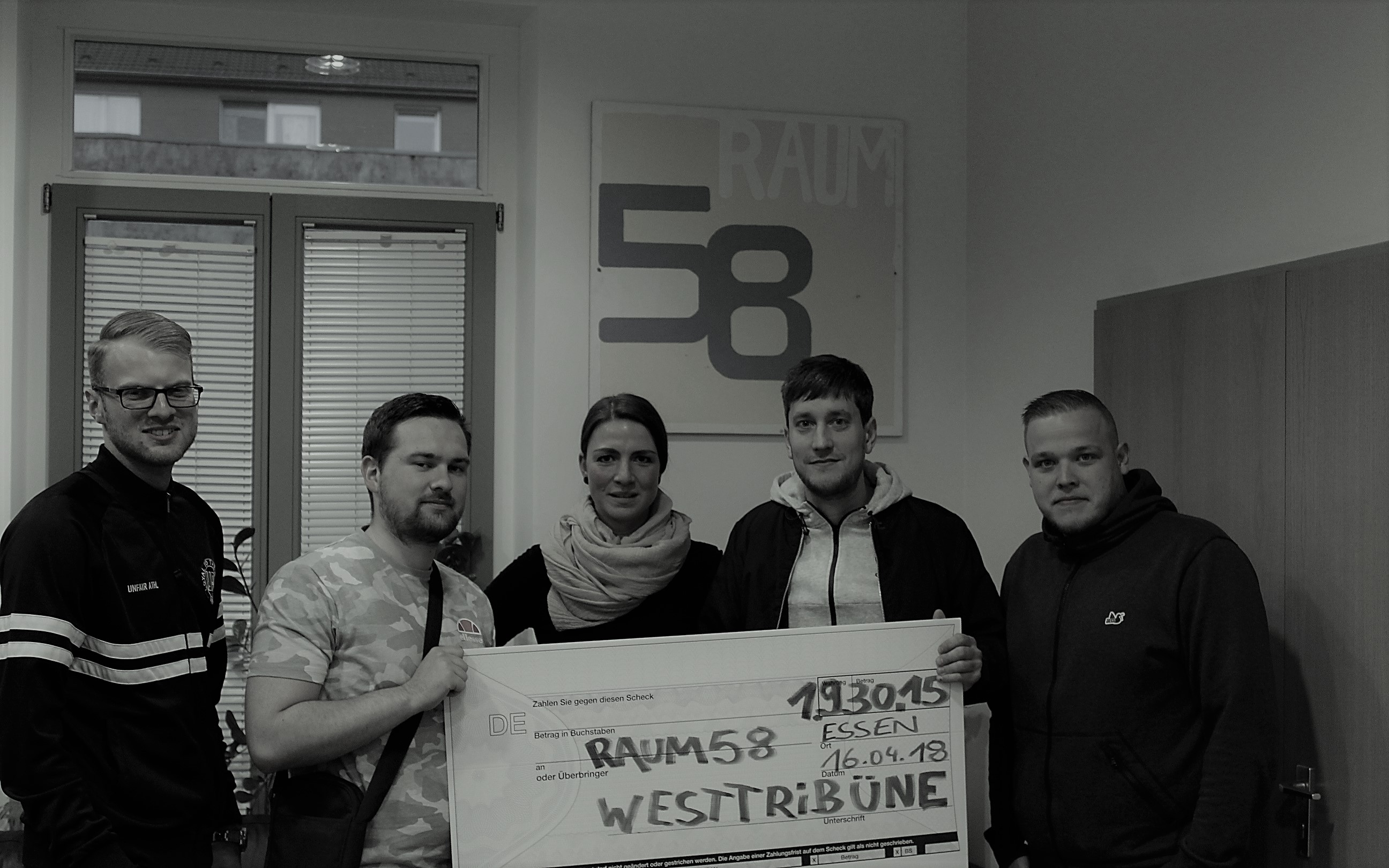 Am heutigen Montag haben mehrere Vertreter der Westtribüne Rot-Weiss Essen den Spendenscheck aus dem Erlös unserer „Tassen-Aktion“ an den Raum58 übergeben. Durch die Unterstützung aller RWE-Fans sind wir nach Abzug aller Kosten auf einen Betrag von 1.930,15 € gekommen. Der Raum58, der Jugendlichen eine Notschlafstelle in unserer Stadt bietet, ist auf Spenden angewiesen, da sich die Einrichtung zu 50% durch diese finanziert. Die Einrichtung ist für viele Jugendliche der letzte Zufluchtsort, wenn sie abends kein Dach mehr über dem Kopf haben und an anderen Institutionen schon abgewiesen worden sind. Die Schlafstelle bietet jeden Abend, ab 21.00 Uhr, acht Jugendlichen im Alter von 14-21 Jahren Obdach. Die Jugendlichen kommen an diesem Ort miteinander in Kontakt, bekommen eine warme Mahlzeit und können die sanitären Anlagen des Hauses nutzen, um ihre Wäsche zu waschen oder sich zu duschen. Darüber hinaus stehen den Jungs und Mädels jederzeit Sozialarbeiter mit einen offenen Ohr zur Verfügung, die beraten und Hilfeleistung geben, wenn gewünscht. Für dieses soziale Engagement haben sie Achtung und unseren Respekt verdient.